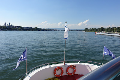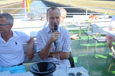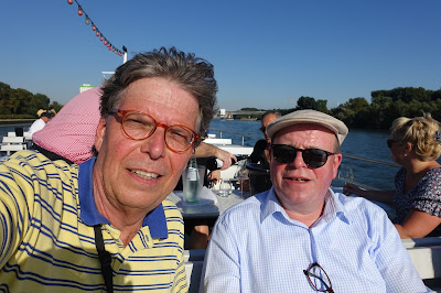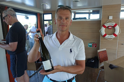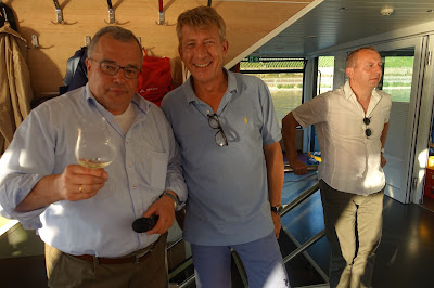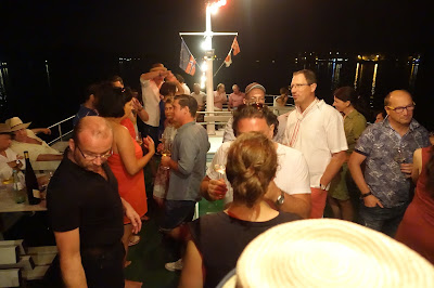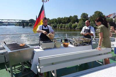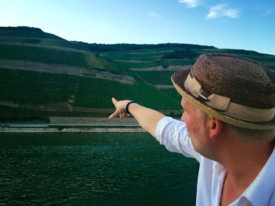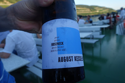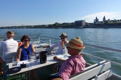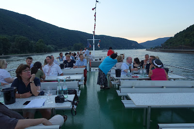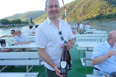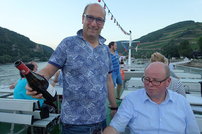 This year, we took a boat trip from Hochheim to Assmannshausen and tasted the wines as we passed the vineyards. The trip back from Assmannshausen was a party with more tasting, good food and other activities. For example, for a while I played cards with August Kesseler of Weingut August Kesseler, Wine Journalist Oliver Bock (FAZ) and Ralph Schönleber, Wein- und Sektgut Schönleber. We left Wiesbaden at 3 pm and came back at midnight.